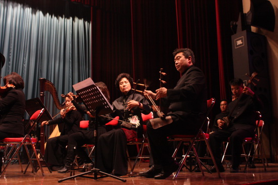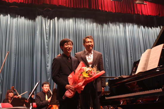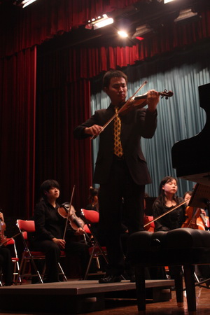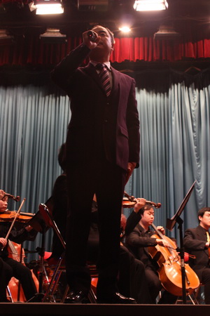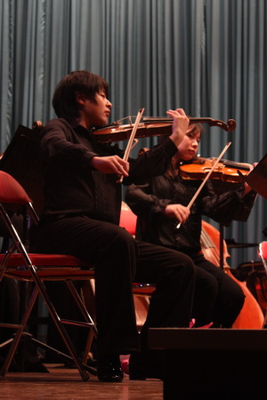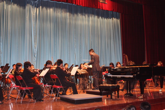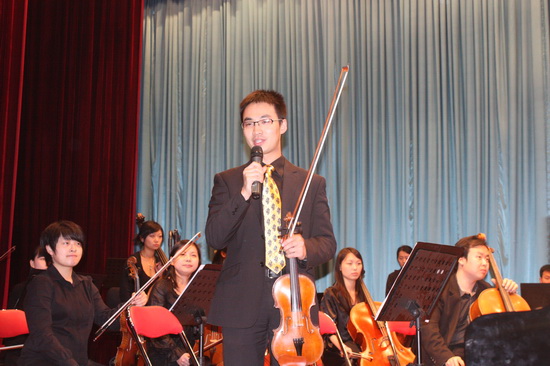 音乐会由贝多芬的《C 小调第五交响曲》第一乐章拉开帷幕。铿锵有力的鼓声犹如宁静天空中的雷鸣,叩问命运的不公, 淋漓尽致地表达出贝多芬对命运的挣扎与不服输的勇气。由EOS乐团首席及助教高参独奏的《D 大调小提琴协奏曲》第三乐章,则以一段令人遐思的平静而又抒情的乐章,在幽雅中表现出宗教般的虔诚。接下来,EOS乐团与梅兰芳京剧团合作,为大家呈现别开生面、中西合璧的交响京剧。著名京剧表演艺术家李宏图演唱的《罗成叫关》,以其雄浑的气势,高亢的嗓音唱出了战士奋战边疆、宁死不屈的精神;50年来梅派唯一的乾(男)旦传人胡文阁先生演唱了《拈香惊艳》,缠绵地诉说出杨贵妃深居宫中的哀怨;“音乐三铁人”张精冶、赵旭阳、谭小棠带来合奏——《C 大调小提、大提和钢琴协奏曲(三重协奏曲)》第一乐章,小提琴轻柔地表达出丝丝情语,大提琴醇沉地回应着小提琴的倾诉,钢琴则犹如流水般绵软清透地浸润人们的心灵。曲终,我 校团委书记王罡 与中央音乐学院乐队学院院长胡咏言交换了礼物。音乐会在EOS乐团加演的两首曲目《千与千寻》、《天空之城》中落下帷幕。