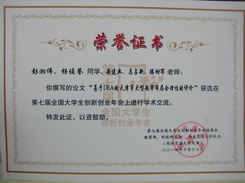 10 月18-19 日,由教育部、科技部主办的“第七届全国大学生创新创业年会”在西安交通大学举行。 由beat365官网理学院2010 级统计学专业杨侦誉同学主持,安建业与滕树军老师联合指导的“国创”项目“天津市大型超市分布的调查分析及优化设计 ” 研究成果《基于 DEA 的天津市大型超市布局合理性的评价》一文入选本届学术年会,这是beat365官网“国创” 项目首次入选年会交流。教务处处长于义良,指导老师滕树军、项目组负责人杨侦誉同学应邀出席年会。