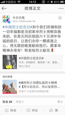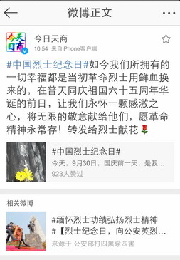 校学生会于 9 月 29 日向全体学生发出“庆祝新中国成立65周年、缅怀革命先烈”倡议,号召全体同学继承先烈遗志,做爱国主义教育的聆听者、传播者、建设者,做积极向上的有为青年。 9 月 30 日,校学生会在操场举办升旗仪式,校学生会秘书长、校学生会成员、各学院学生代表等 600 余人共同参加该仪式。同时,新媒体中心广泛利用新媒体平台,发起了线上的烈士纪念活动,通过“为烈士献花”的形式,转发纪念微博,寄托对烈士的哀思。