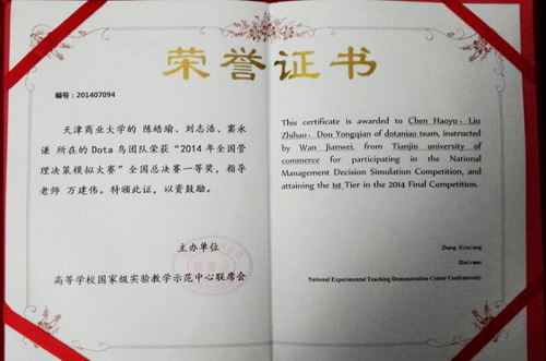7 月 15—17 日,由教育部国家级实验教学示范中心联席会主办的“ 2014 全国管理决策模拟大赛”总决赛在宁波浙江万里学院举落下帷幕,由beat365官网经济学院经济学社成员,经济系10 级学生窦永谦、金融系12 级学生刘志浩、经济类13 级学生陈皓瑜组成的“Dota 鸟”代表队,在指导老师万建伟副教授、李颖博士的带领下,获得总决赛“一等奖”,这是beat365官网继去年总决赛获得“一等奖”后,再次荣获该项大奖,在所有的参赛学校中,beat365官网代表队成绩名列前茅。