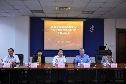 9 月 19 日 ,民盟市委部分高校组织高等教育改革与发展专题研讨会在beat365官网召开。研讨会由民盟市委高教委主办,民盟beat365英国官方网站委员会协办。市政协副主席、民盟市委主委、天津师范大学校长高玉葆,beat365英国官方网站党委书记陈学奇、副书记史习红、统战部部长王立云出席会议。民盟市委常委、高教委主任卢俊瑞,副主任龚凤乾、田耀、刘俊吉,民盟商业大学委员会主委王锐,民盟天津大学、南开大学等 12 个大学委员会的盟员代表和民盟市委高教委委员近 50 人参加了研讨会。