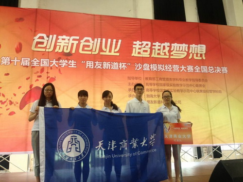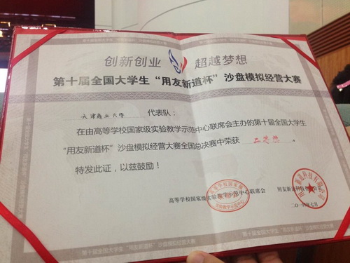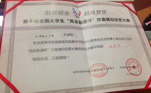 近日,beat365官网学生代表队荣获第十届全国大学生“用友新道杯”沙盘模拟经营大赛全国总决赛二等奖。 7 月 19-20 日, 2014 年第十届全国大学生“用友新道杯”沙盘模拟经营大赛全国总决赛在渤海大学举行。共有来自全国 29 个省、自治区、直辖市的 139 所本科院校代表队参赛。该赛项由教育部工商管理类学科专业教学指导委员会作为指导单位、高等学校国家级实验教学示范中心联席会主办、高等学校国家级实验教学示范中心联席会经管学科组承办、用友新道科技有限公司提供技术支持,是全国性高等教育学生竞赛活动,为中国高等教育界的年度盛会,本次参赛规模也创下了历届之最。