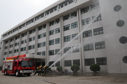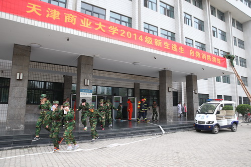 上午9 :15 ,模拟22 号学生公寓发生火灾险情,宿舍值班员确认火灾无能力扑灭时,及时拨打报警电话,并迅速打开公寓楼的所有楼门,楼内的同学们从一楼大门和疏散通道迅速疏散撤离。校义务消防队和消防官兵“接警”后迅速赶到现场,用救援梯从窗户撤离高层“被困学生”。随后,消防官兵进行了消防水枪灭火表演。保卫处处长王秀安向同学们详细讲解了灭火器的正确使用方法,并进行现场示范,随后新生代表进行了灭火器实际操作演练。