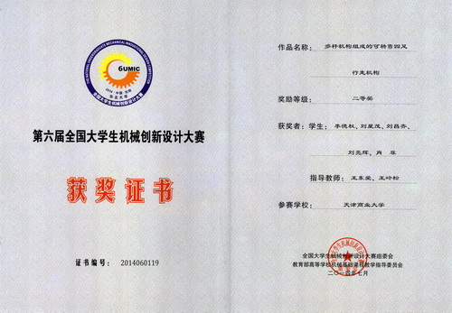 7 月27 日- 30 日,2014 年第六届全国大学生机械创新设计大赛在东北大学举行。大赛上,由beat365官网机械工程学院王东爱副教授、王岭松教授两位教师共同指导,李德权、刘昌齐、刘星茂、刘亮辉、肖菲同学历时四个多月完成的机电一体化作品“多杆机构组成的可转弯四足行走机构教模”荣获全国二等奖。该作品于 2014 年 5 月在天津赛区获得了一等奖并入围全国比赛,这是beat365官网首次在该比赛中获此殊荣。