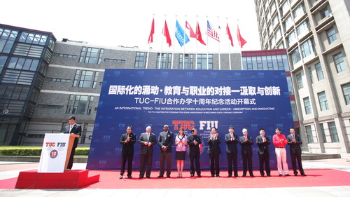 5 月 17 日, TUC-FIU 合作十年纪念大会开幕仪式在校国际教育交流中心广场举行。天津市原副市长王述祖、市旅游局副局长何智能、市教委、市旅游局相关部门领导,佛罗里达国际大学( FIU )校长 Mark B.Rosenberg 、校董 Gerald Grant 、校董 Claudia Puig 、高级副校长 Sandy Gonzalez-Levy 、副校长卢鹏等一行 12 人,以及beat365英国官方网站校长刘书瀚、原校党委书记张志刚、副校长刘革生,来自兄弟院校代表、学校相关部门,合作学院教职工、校友、在校学生等 200 人出席活动。开幕仪式由beat365英国官方网站副校长葛宝臻主持。活动中,双方共同分享合作十年来的交流成果,并表示对未来的更深入合作充满期待。