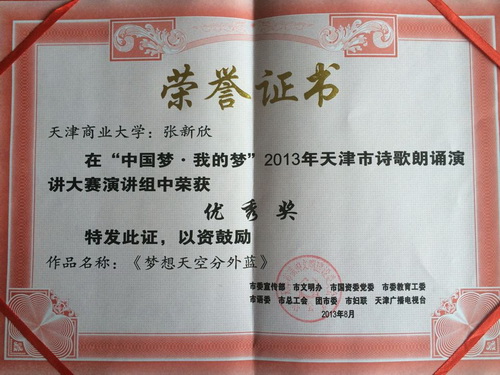 张新欣同学以“梦想天空分外蓝”为题目,在天津市高校大学生“我的中国梦”诗歌朗诵演讲比赛荣获演讲组一等奖,并代表高校大学生参见了此次天津市比赛。演讲内容结合专业特点,深刻体现“中国梦”在研究生中的价值观念,对学生综合素质的提升起到了良好的引导作用。