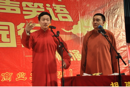 晚七点,诙谐幽默的相声广播序曲在会堂内响起,现场气氛马上活跃起来。随着天津相声广播主持人张宸、穆岩的欢乐开场,相声晚会正式拉开帷幕。星海艺术团相声社的学生演员首先带来四个节目,令人耳目一新。安强的快板《玲珑塔》清脆熟练,吴文智、刘晟的《偷斧子》在传统相声段子的基础上融合了校园元素;刘晨、金子昭的《大学狂想曲》和周哲田、寇悦的《聘文书》也博得了现场的阵阵掌声。曾代表天津青年相声代表访问台湾的相声演员张强和赵旭给观众们带来《说三道四》,一句“上帝造人时的草稿”引得观众欢笑不断;朱明鑫和王琨的《疯狂英语》上演不一样的中英对话。裘英俊和于丹“攒底”出场,他们凭借其多年舞台经验,带来风趣的相声表演,获得观众热烈掌声。