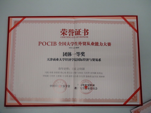 12 月6 日,历时近一个月的第三届POCIB 全国大学生外贸从业能力大赛落下帷幕。经济学院国际经济与贸易系代表队20 名成员在指导教师王威、过晓颖的带领下,取得团体一等奖的好成绩,孙昊达、王玉凤、徐曼、王世强、张先翠、马雪琴等20 名同学分获个人一、二、三等奖。