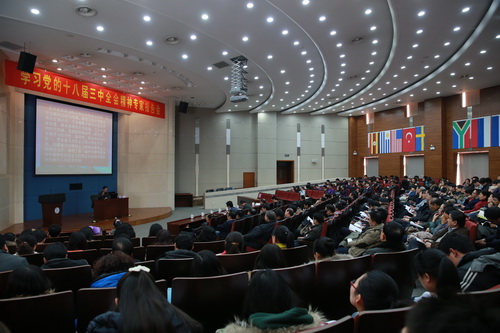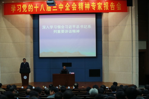 12 月18日下午,学校在图书馆国际报告厅举行学习党的十八届三中全会精神第二场专家报告会。中共天津市委党校副校长、校务委员会委员、天津行政学院副院长赵晓呼教授应邀作了题为 “ 深入学习领会习近平总书记系列重要讲话精神”的专题报告。报告会由校长刘书瀚主持,校领导杨万义、马三津、葛宝臻、路波出席,全体中层干部,各学院辅导员,全体教工和学生党支部书记,以及机械工程学院、马克思主义学院、生物技术与食品科学学院的师生代表 300 余人参加了报告会。
