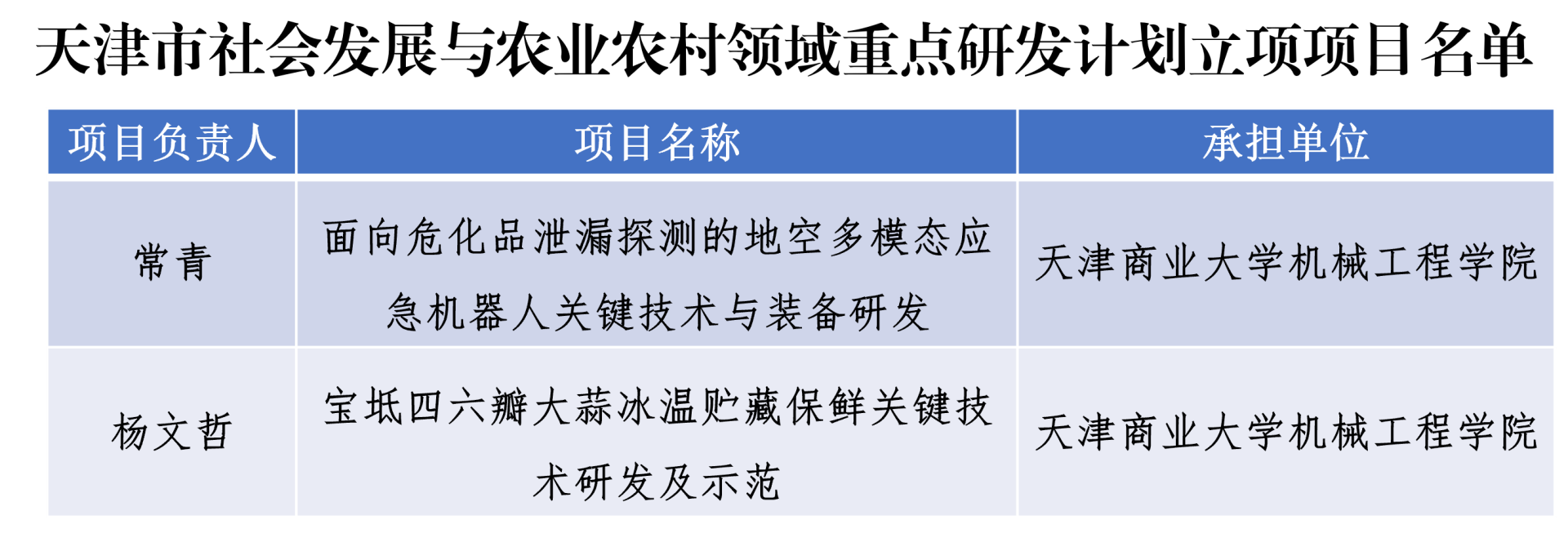 近日,天津市科学技术局公布了天津市社会发展与农业农村领域重点研发计划立项项目名单,beat365官网机械工程学院常青副教授和杨文哲副教授主持申报的两项科研项目成功入选。