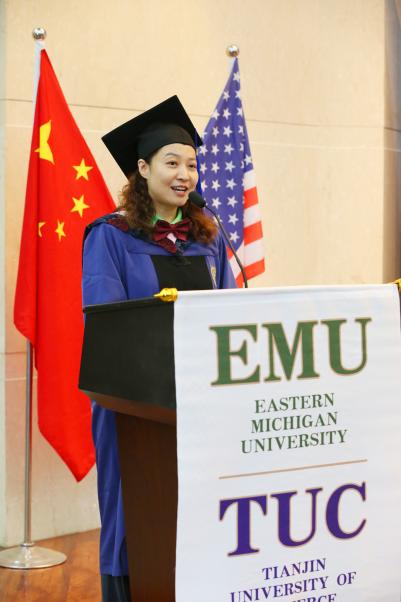 毕业生代表、天津二商集团张颖璐同学在发言中向给予大力支持的母校,向倾心教导的老师表示感谢。她重温了两年前加入项目学习时的激情与笃定,回顾了两年间老师们耐心讲解、循循善诱,同学们勤勤恳恳、互学互鉴的点点滴滴,分享了如今如愿获得学位证书的喜悦,展望未来,她表示“梦在前方、路在脚下;未来可期、奋斗以成”,今后会铭记“笃学 弘毅 明德 济世”的校训,在更广阔的舞台上施展才干,在高质量发展的新征程上书写“功成必定有我”的新篇章。