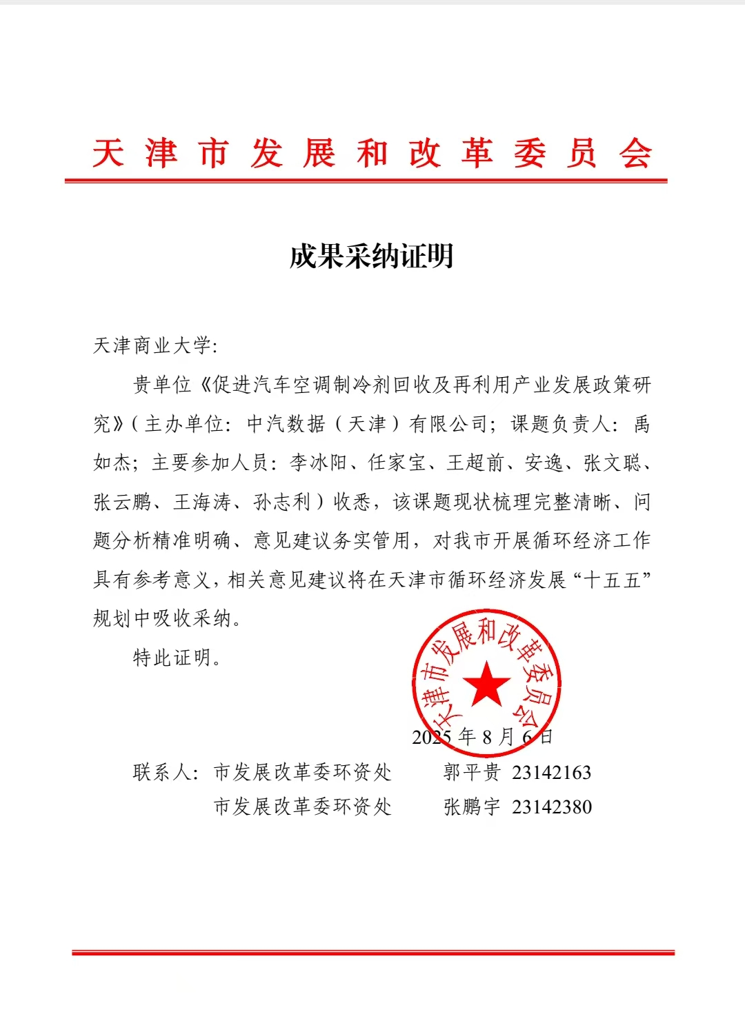 8月6日,天津市发展和改革委员会公布循环经济领域研究课题征集结果,由中汽数据(天津)有限公司、天津澳宏环保材料有限公司,以及beat365官网联合申报的《促进汽车空调制冷剂回收及再利用产业发展政策研究》被成功采纳。