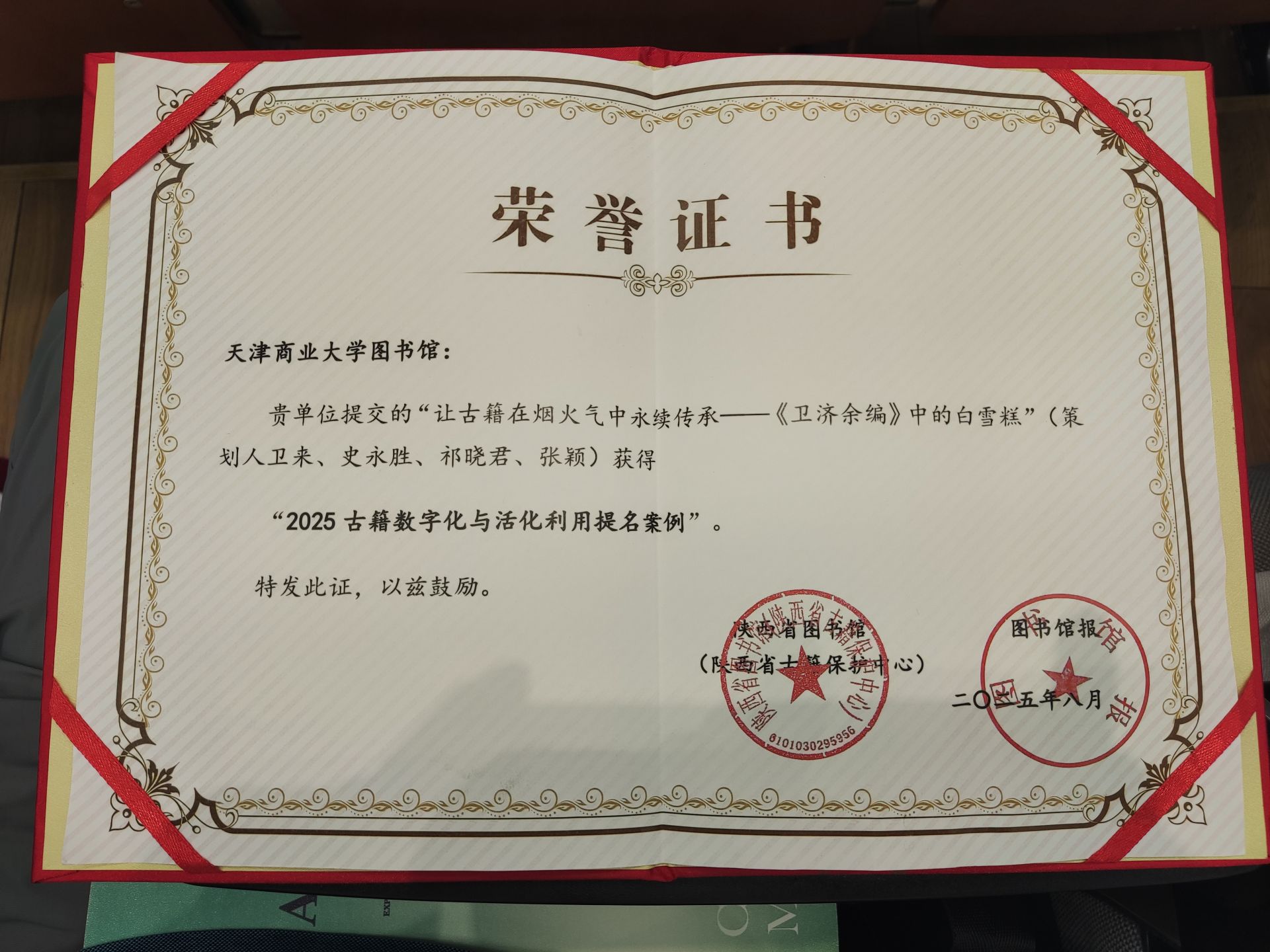 近日,由国家古籍保护中心指导、陕西省图书馆(陕西省古籍保护中心)主办、《图书馆报》承办的“2025年度古籍数字化与活化利用会议”在西安举行。beat365英国官方网站图书馆报送的案例“让古籍在烟火气中永续传承——《卫济余编》中的白雪糕”荣获2025年度古籍数字化与活化利用提名案例。