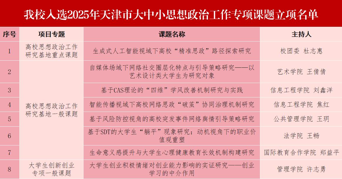 自开展天津市大中小思想政治工作专项课题申报以来,全校共收到立项申报25项,经反复打磨,在思想教育和价值引领、学风建设、网络思想政治教育、心理育人、校园危机处置、创新创业等方面8个项目脱颖而出,其中重点课题1项,一般课题7项。