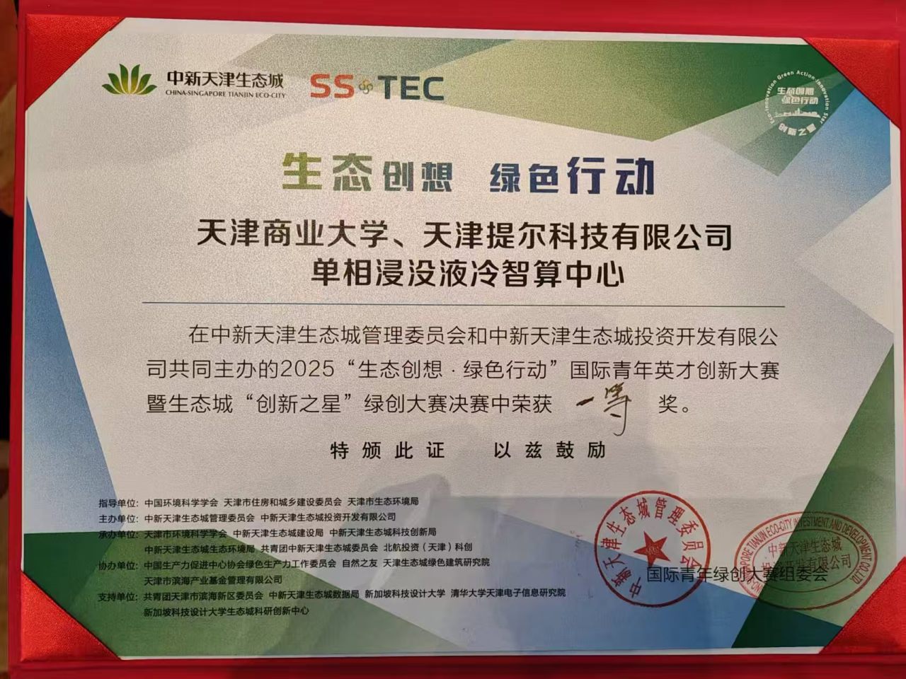 本次大赛由中新天津生态城管理委员会(生态城管委会)和中新天津生态城投资开发有限公司(生态城合资公司)联合主办,深入贯彻落实“创新驱动发展”战略,聚焦“双碳”目标,吸引了来自国内外众多优质创新项目参与角逐。李雪强团队深耕数据中心绿色冷却技术领域,依托天津提尔科技有限公司研发的“单相浸没液冷智算中心”项目,以先进技术为核心,致力于推动数据中心能源消耗降低与冷却技术迭代升级。