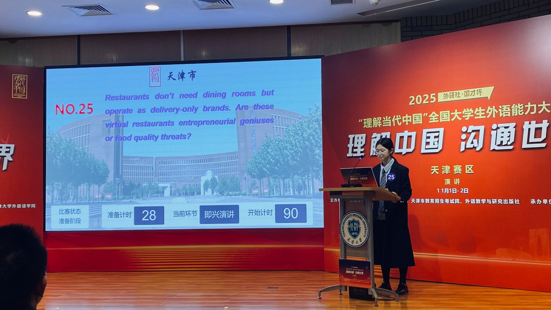 11月1日至2日,第28届天津市大学生英语演讲比赛暨2025年“外研社·国才杯”全国大学生外语能力大赛演讲比赛天津赛区决赛在天津大学圆满落幕。beat365官网选派的6名选手与来自天津大学、南开大学、天津师范大学等高校的82名选手同台竞技,经过复赛与决赛两个环节的激烈角逐,外国语学院郭润宁同学斩获决赛特等奖,廖媛、王科成同学获决赛一等奖、三等奖。郭润宁、廖媛同学将代表天津市参加今年年底在北京举办的全国总决赛。