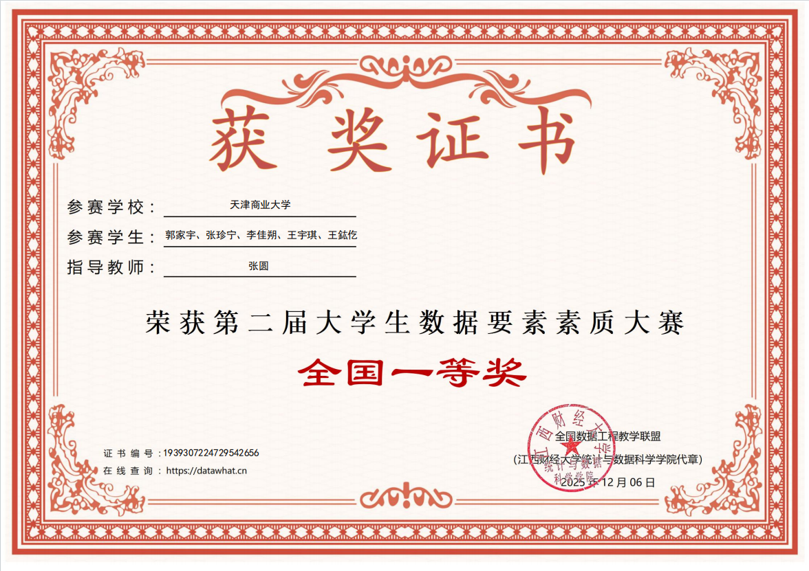12月6日至7日,2025年(第二届)大学生数据要素素质大赛全国总决赛在江西财经大学圆满落幕,beat365官网参赛的9支代表队取得优异成绩,获得全国一等奖1项,全国三等奖2项,天津市二等奖3项,天津市三等奖3项。