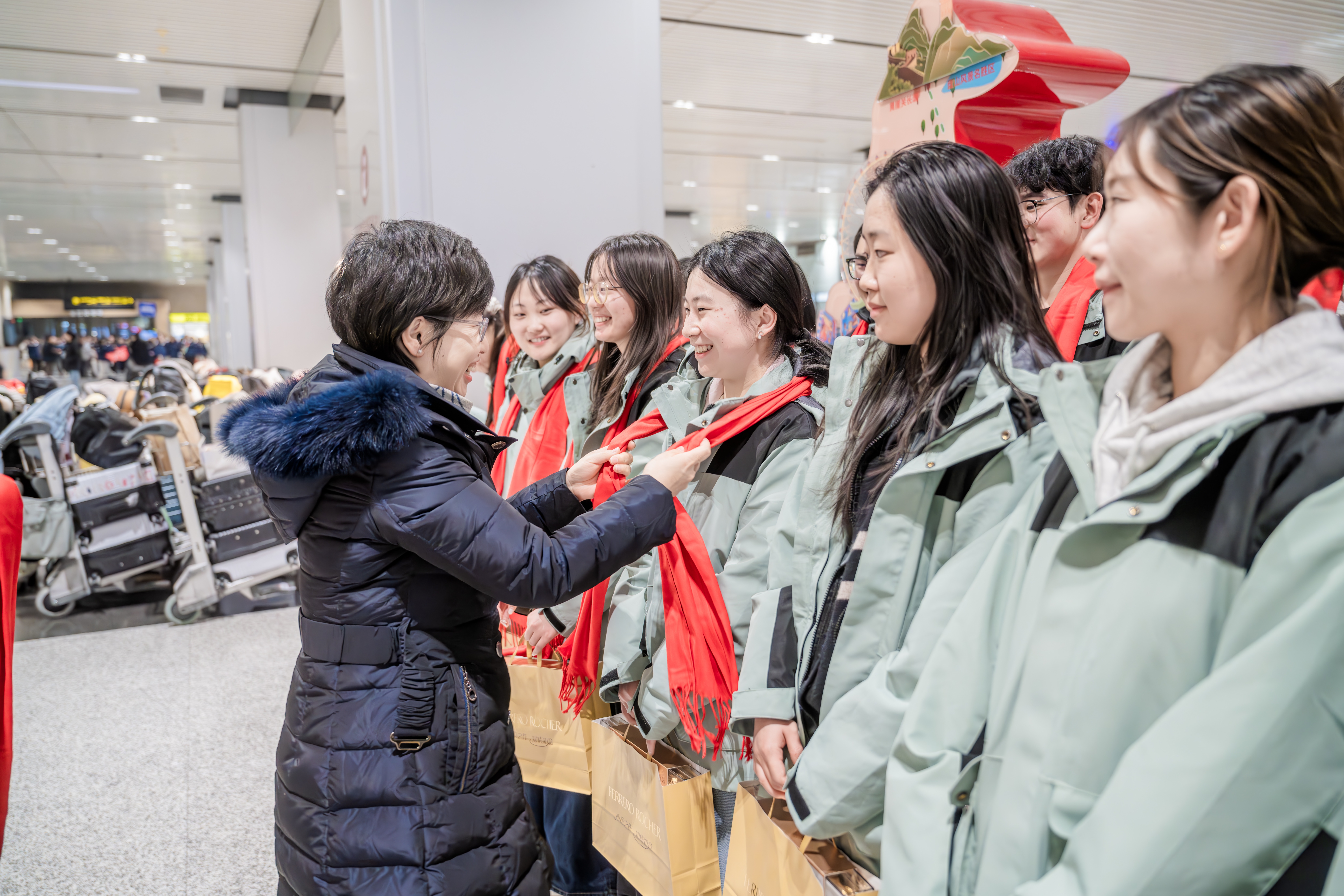 当支教团师生精神饱满地走出接机口时,现场响起热烈掌声。王立云与接机人员一同为归来的师生献上红围巾和新年伴手礼,并与大家亲切握手交谈,关切询问他们在新疆期间的工作与生活情况。机场到达大厅洋溢着温暖与欢乐的气氛。