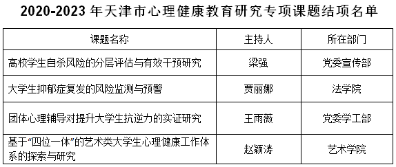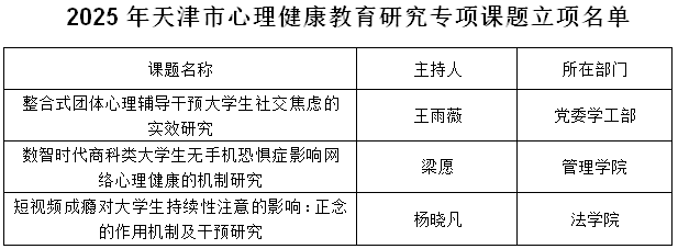 近日,天津市委教育工委、市教委公布2025年天津市心理健康教育研究专项课题立项名单和2020-2023年天津市心理健康教育研究专项课题结项名单。beat365官网王雨薇、梁愿、杨晓凡三位教师申请2025年心理健康课题获批立项,梁强、贾丽娜、王雨薇、赵颖涛四位教师主持课题顺利结项。