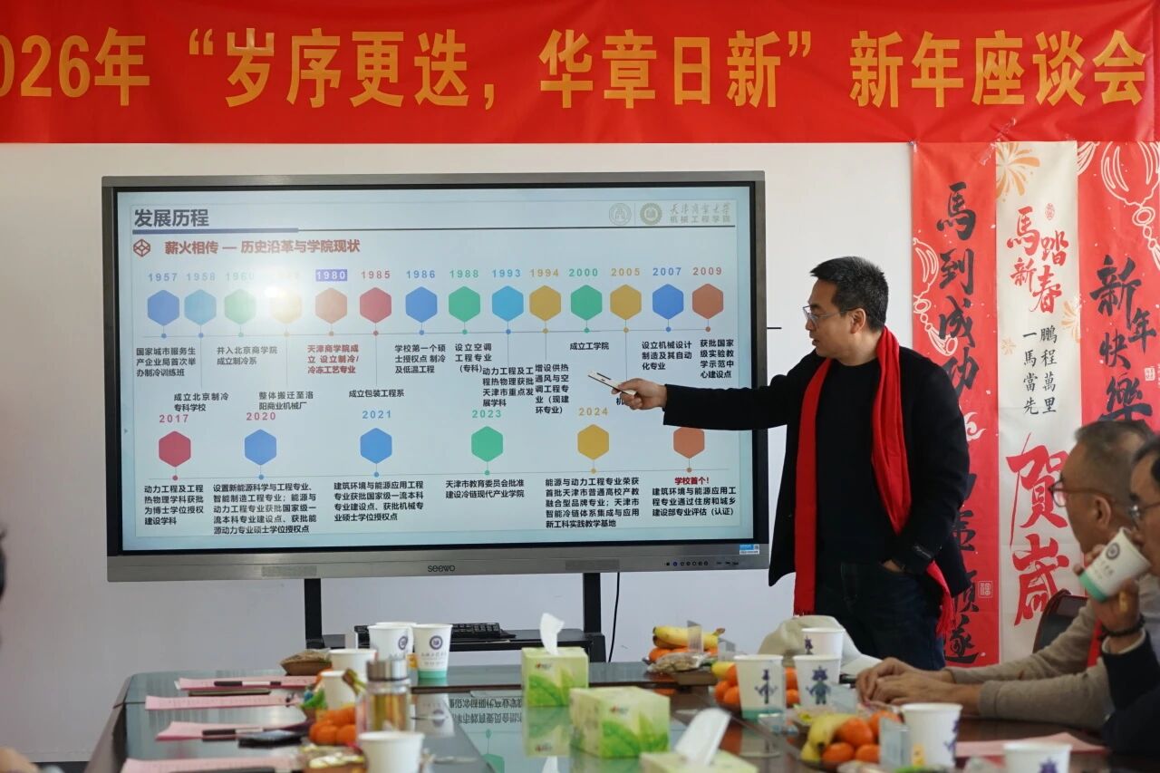 1月21日下午,机械工程学院举办“岁序更迭 华章日新”新年座谈会暨“冷暖天商 专业发展历程及办学成果展”开幕仪式。校党委副书记王立云出席开幕仪式并为展览揭幕。学院历任领导李树立、郭建伟、李勤国、张建东、申江、臧润清、计宏伟、刘振强、田海荣、杨传民、郭宪民、张晨阳、刘斌、王怀文、邹同华及学院1982级制冷专业校友、维克(天津)有限公司董事长袁晖,1995级制冷与低温技术专业校友、享受国务院政府特殊津贴专家张雪囡受邀参加活动。学院领导班子和教师代表参加活动,活动由学院院长刘圣春主持。