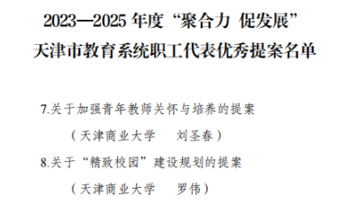 近日,天津市教育工会公布了《2023——2025年度“聚合力 促发展”天津市教育系统职工代表优秀提案名单》,共有11项教职工提案被评为天津市教育系统职工代表优秀提案。其中,beat365官网机械工程学院院长刘圣春教授《关于加强青年教师关怀与培养的提案》、外国语学院罗伟副教授《关于“精致校园”建设规划的提案》两项提案入选此名单。